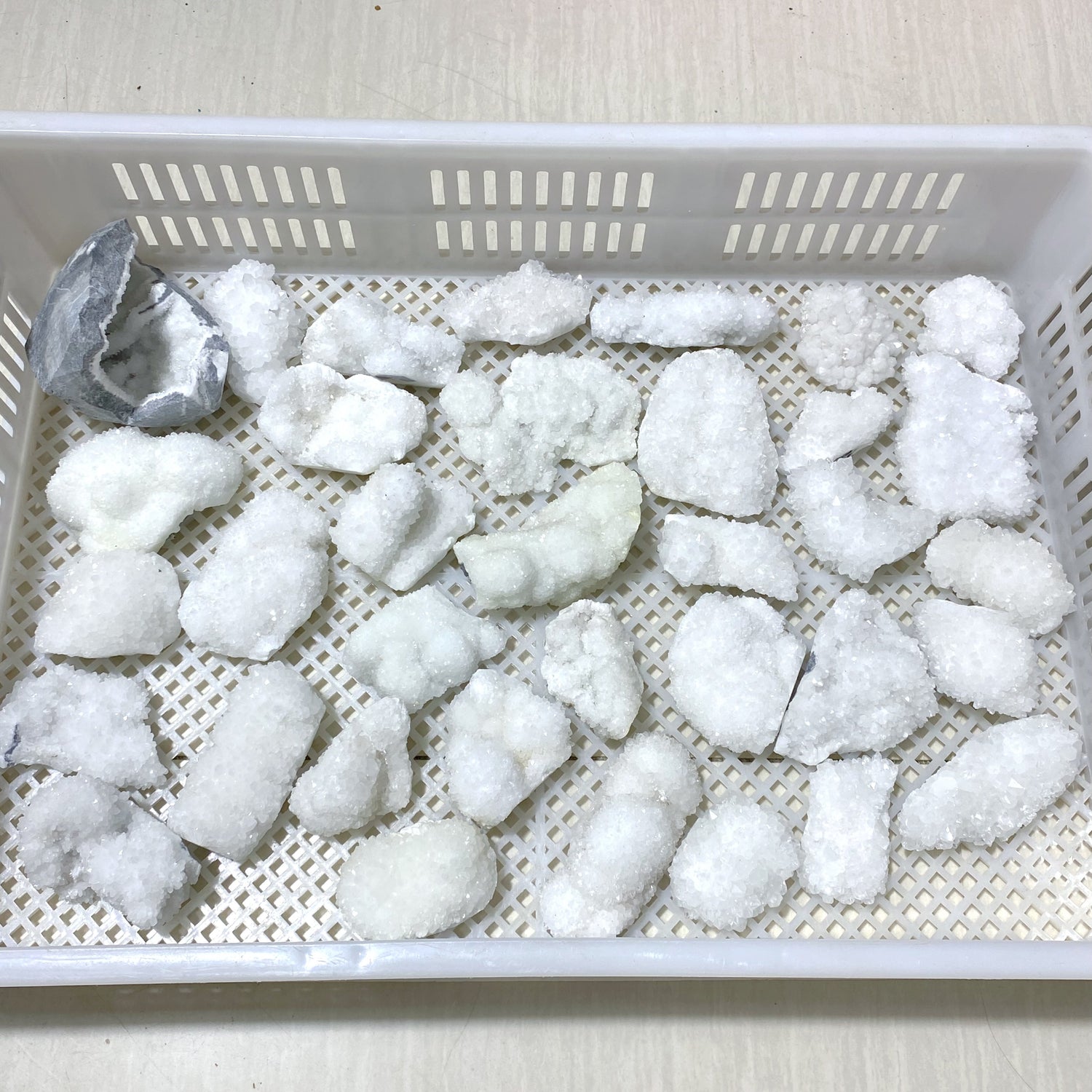 We sell our raw clear quartz cluster specimen in lots that are 35pcs, you will get the same basket of stones as in the photo and video.