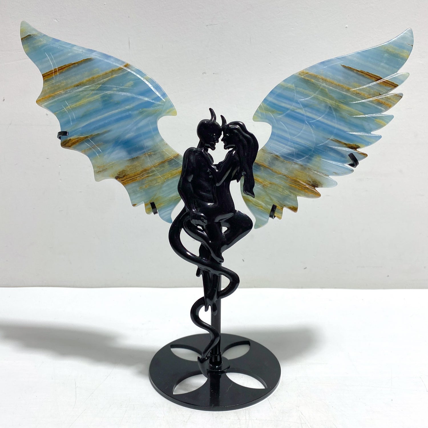 Unique Blue Onyx Demon And Angel Wing Carving With Stand